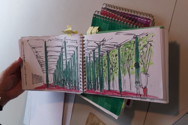 手にこう持ってね。これは筆ペンを使っているけど、このペンはたしかに移動しているときに楽なんだよ、筆圧がいらないから。万年筆で描くとノートを横開きのまま持っていられないんだよ。筆ペンだと、こうやってなんとなくさらさらっと。まあ荒くなるんだけれども。見開きというのは、気分いいでしょう。風景を描く場合、最近はこれが気にいってるんだよ。